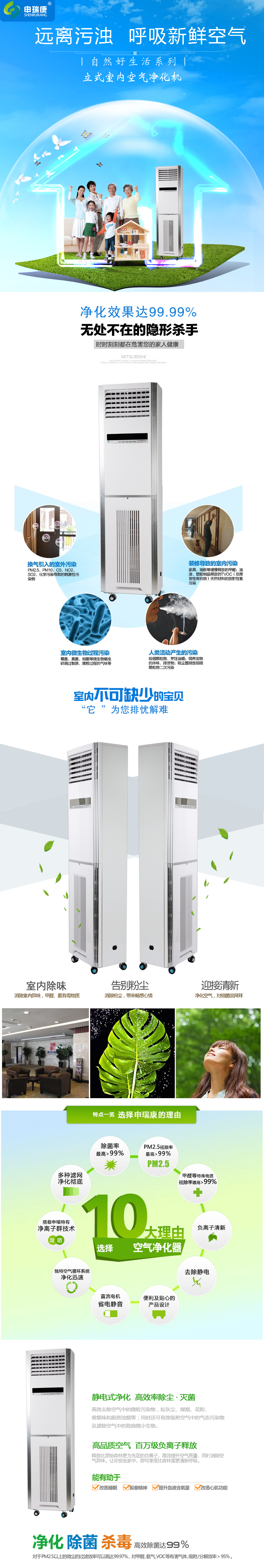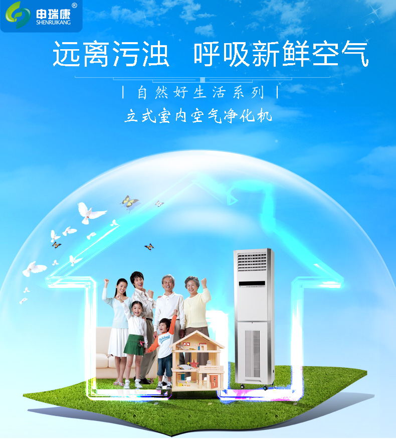 申瑞康落地式空氣凈化器由進風口、預過濾系統、高效過濾系統、風機、二段式高壓靜電場、浸漬型活性炭網、負離子發生器等部件組成。預過濾系統,首先對空氣中較粗的飄塵粉塵截流過濾,一般5-6微米左右的飄塵粉塵可通過預過濾系統完成。設立的二段式高壓靜電場,它具有最佳集塵效果和最大的集塵面積。當污濁的空氣進入電場極區時,靜電場立即對空氣中飄塵粉塵、細菌、氣溶膠等雜質進行極化,使其帶上電荷,帶電的污染物進入高壓電場時被強烈的收集,被極化后的污染物被集塵區的極片有效吸集。最后還設置了浸漬性活性炭,用以吸附污濁氣體分子。 (1)電子集塵室除塵、滅菌凈化: